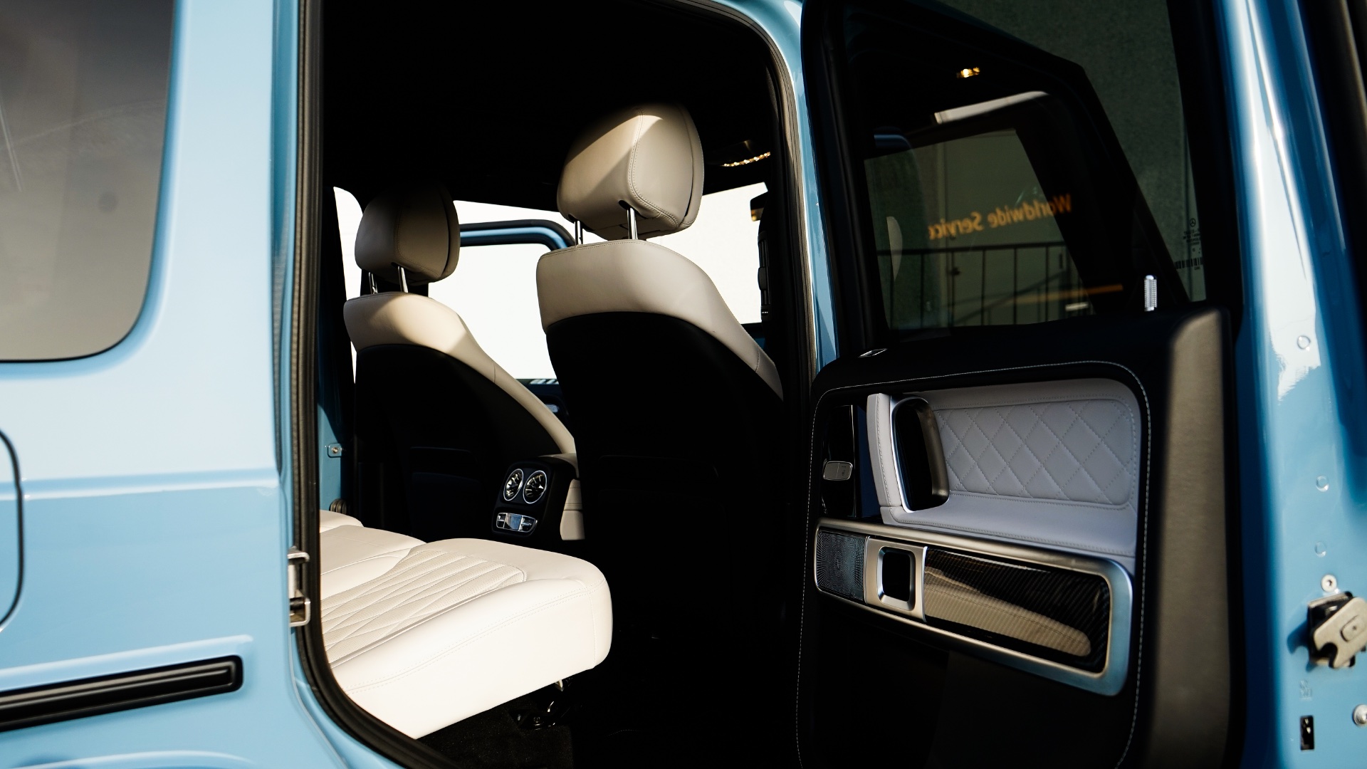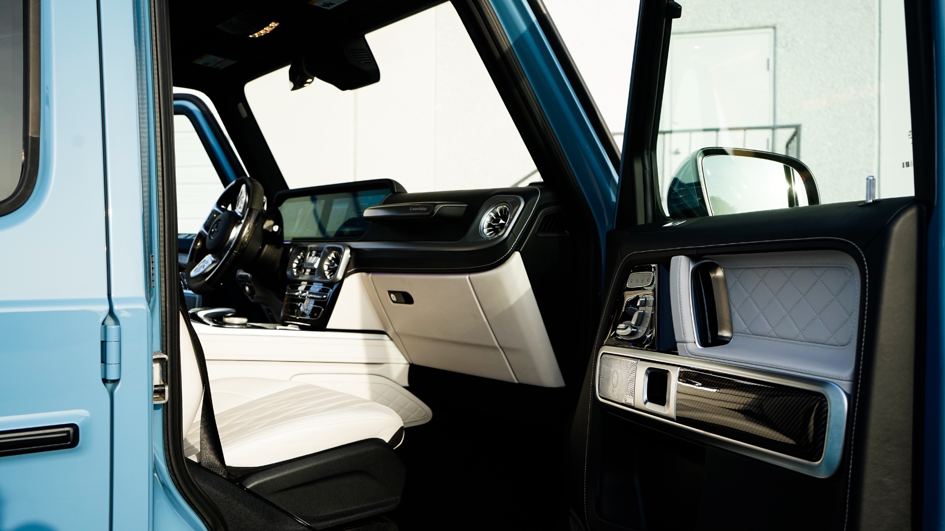 The Mercedes-Benz G63 China Blue stands apart in Los Angeles' luxury landscape with its extraordinary finish—a sophisticated blue hue that shifts between deep oceanic tones and vibrant azure depending on the California light. This exclusive colorway transforms the iconic G-Class silhouette into a rolling work of art, perfect for those who appreciate automotive rarity and distinction.