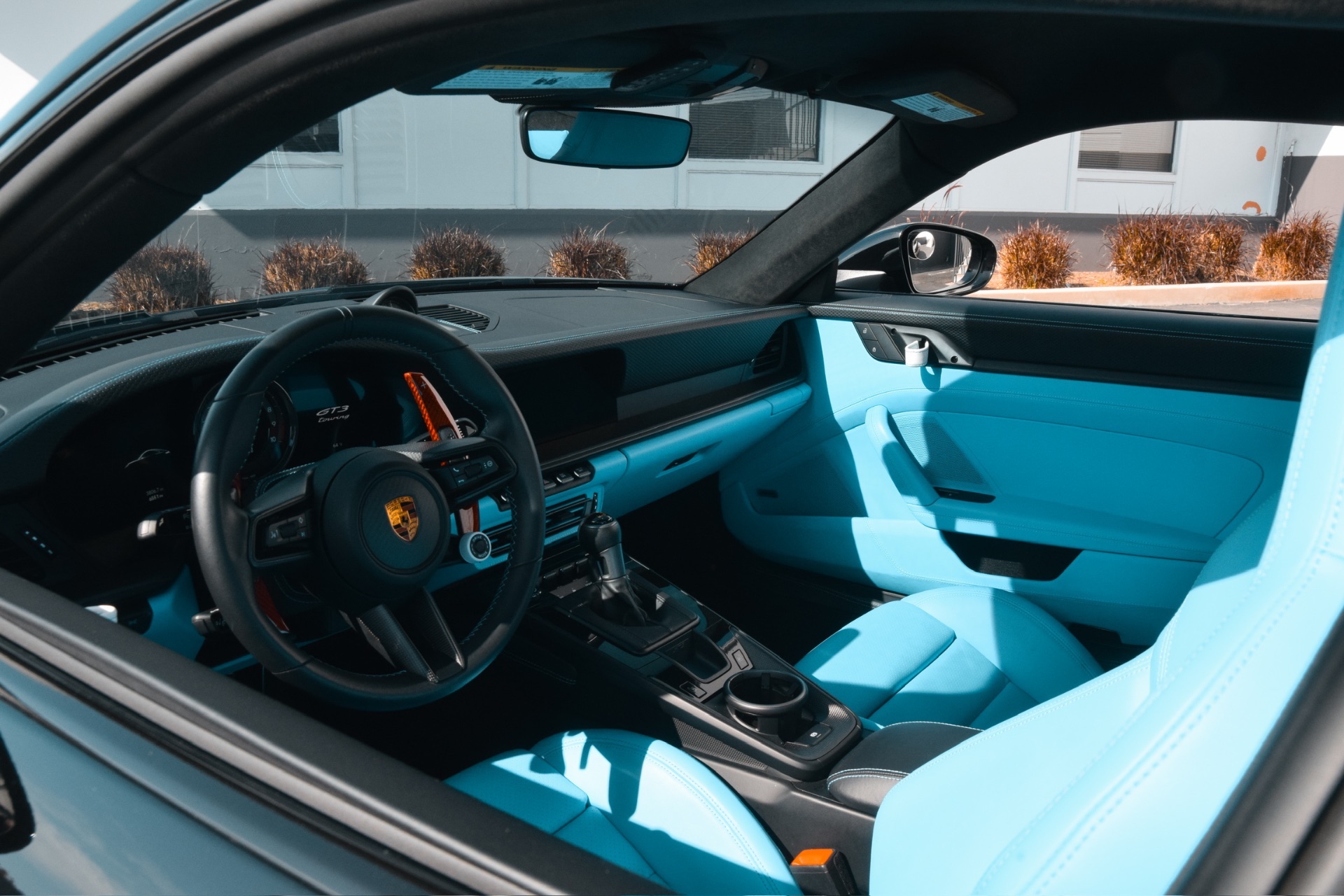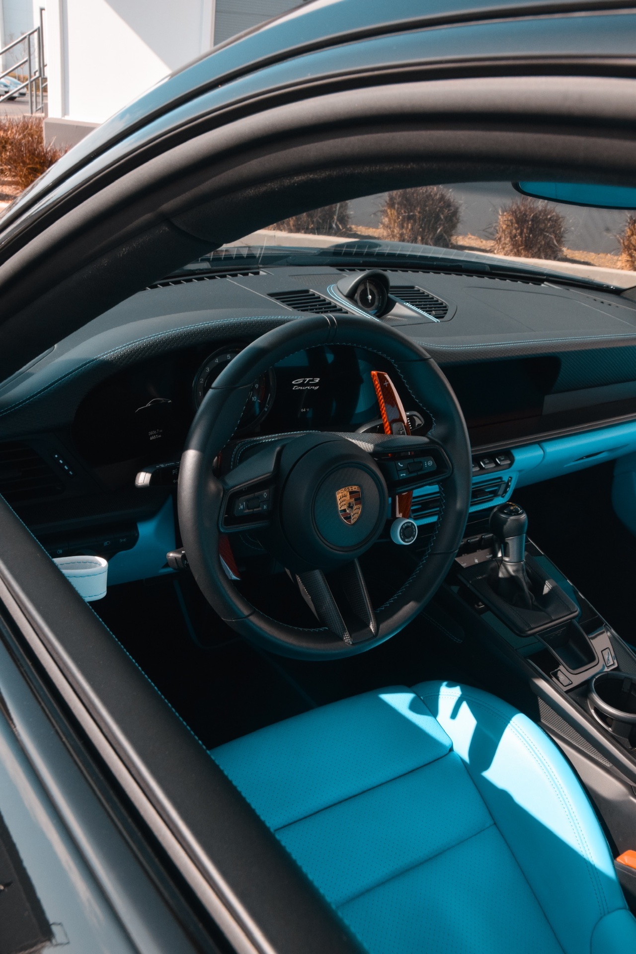 From the outside, the GT3 Touring is indistinguishable from a standard 911 to the untrained eye. The fixed rear wing is replaced by a subtle retractable spoiler, keeping the roofline clean and the stance elegant. In black, this restraint becomes something else entirely — a car that looks like it belongs in a private collection, not a rental fleet. Then you open the door. The deep blue leather interior — bold, unexpected, and entirely deliberate against the black exterior — announces that this is no ordinary 911. Black outside. Blue inside. Restrained from every angle that matters, extraordinary in every detail that counts.