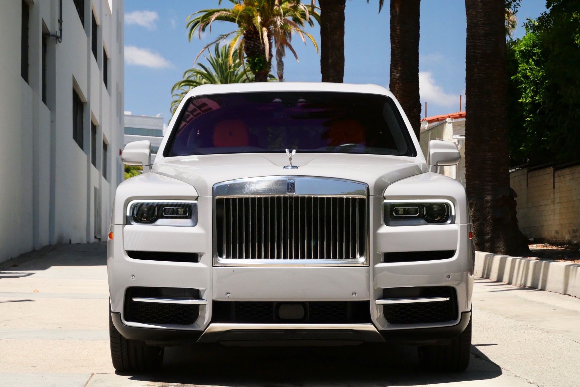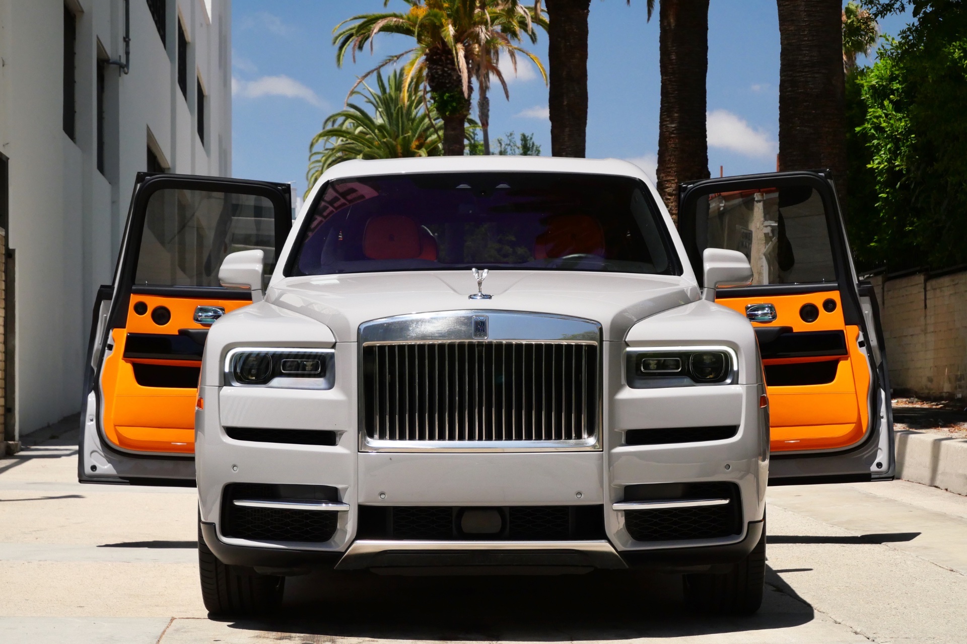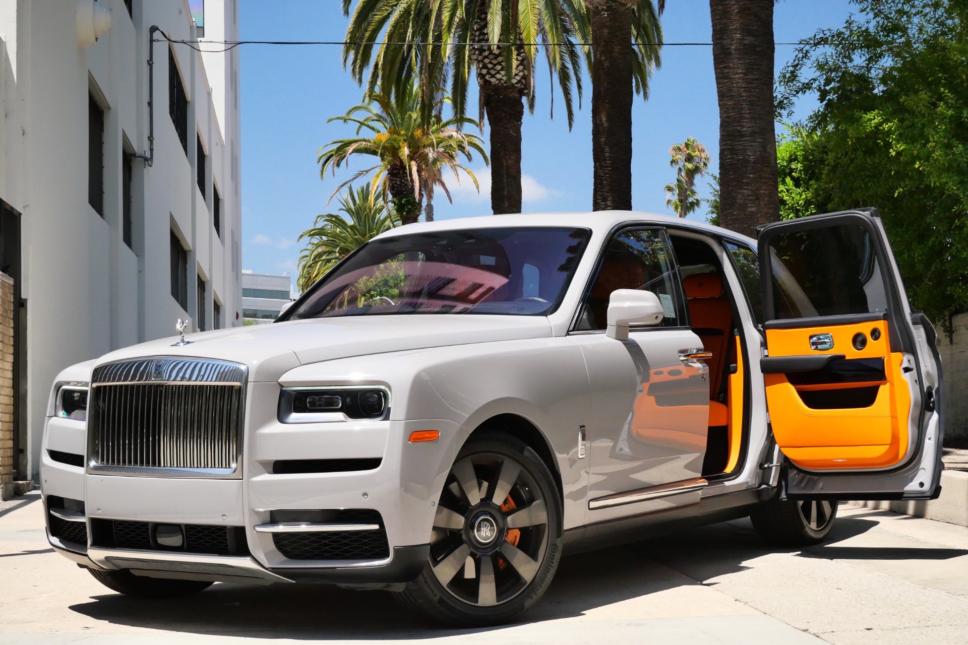 The striking grey exterior finish creates a sophisticated foundation for the vehicle's imposing silhouette, while the vibrant orange interior represents a bold artistic choice that reflects contemporary luxury sensibilities. Every design element, from the iconic Spirit of Ecstasy to the distinctive Pantheon grille, has been meticulously crafted to project authority and refinement on Los Angeles' most prestigious thoroughfares.